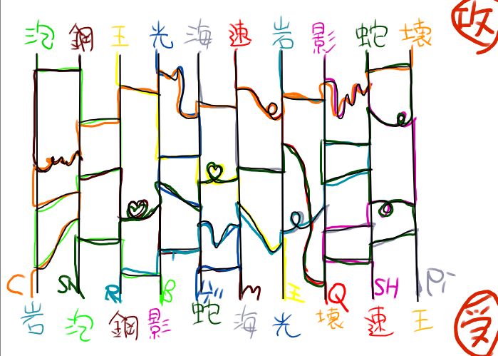 いつものようにアンケやフリリクを受け付けると、たぶん消化しきれなくなるので、今回は拙ブログに比較的登場している10人をそれぞれ攻めと受けに分けてアミダクジをし、その結果できあがったカップリング10組のうち、書け!と人気だった上位3つを書こうと思います。